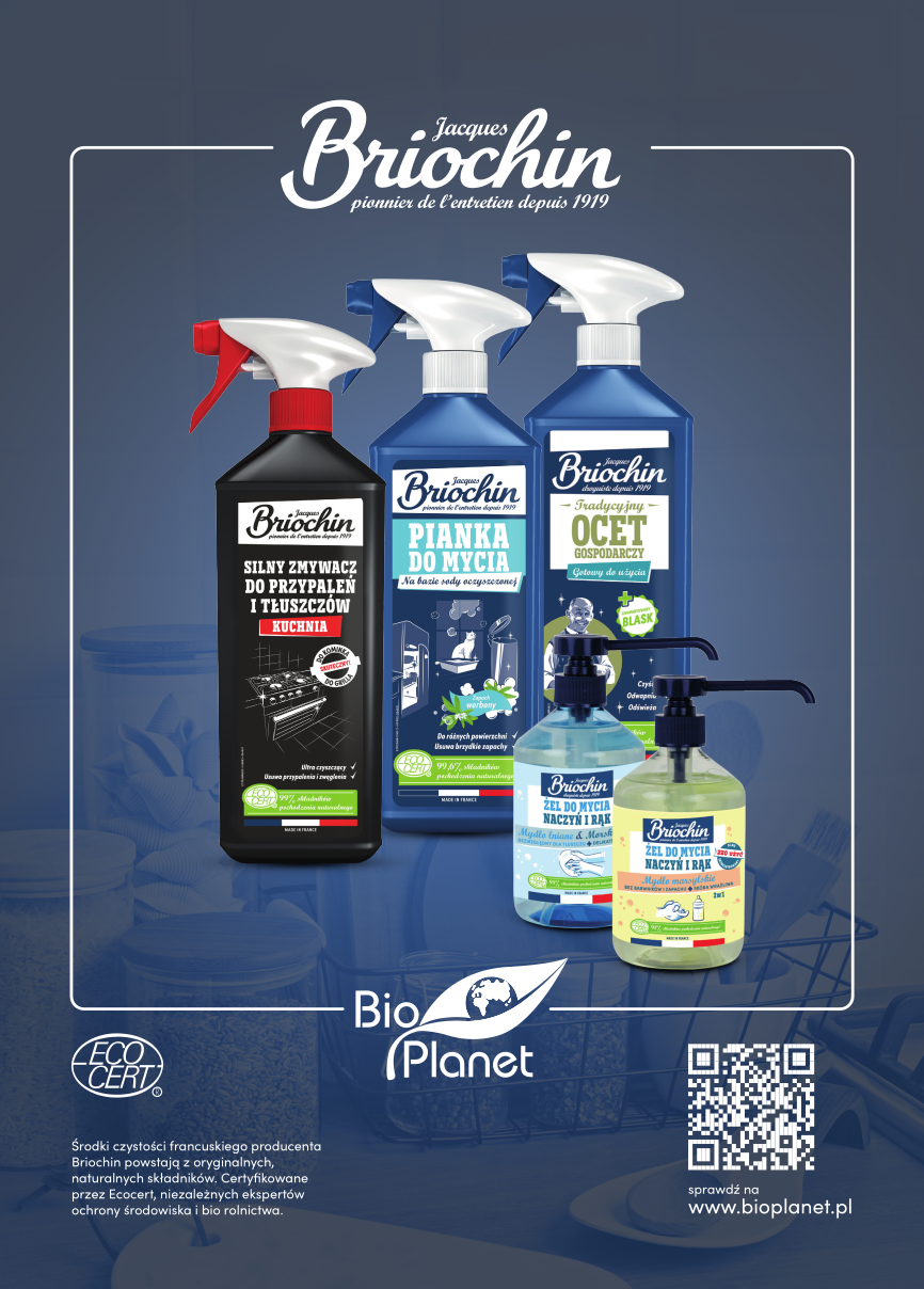 Kolejny przykład to Ocet gospodarczy Briochin – tradycyjny produkt o ogromnych możliwościach. Wszechstronne zdolności octu gospodarczego są dość powszechnie znane. Jak jednak wykorzystać pełen potencjał octu w kuchni? Ten prosty, tradycyjny składnik może zastapić wiele specjalistycznych środków. Ocet skutecznie usuwa kamień z czajnika i odwapnia wylewke kranu, a w połaczeniu z woda (1:1) może działać jako naturalny odswieżacz powietrza. W razie braku zapasu nabłyszczacza do zmywarki, ocet może stanowić jego zamiennik, zapewniając blask naczyń. Sprawdza się też przy myciu szklanych gablot i płytek ściennych, przywracając im połysk, a dodatkowo można go używać do czyszczenia desek do krojenia i blatów, neutralizując nieprzyjemne zapachy. Jeden produkt, wiele zastosowań – prosty sposób na sprzatanie w duchu less waste.