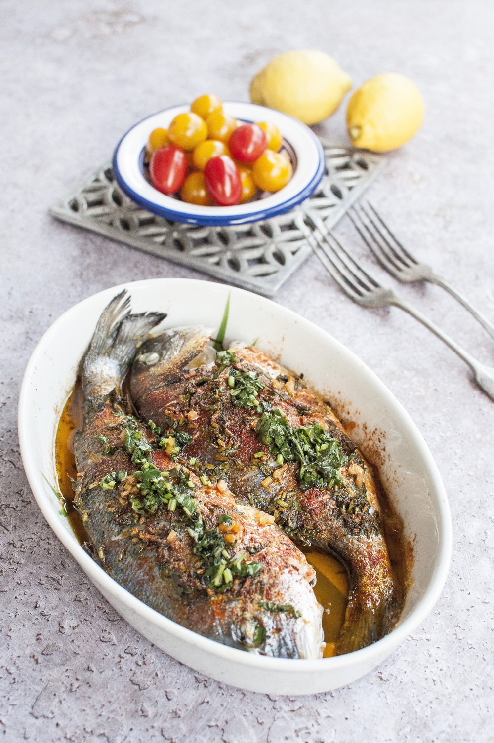 Zacznij od przygotowania chermuroli. Zioła drobno posiekaj lub zmiksuj pulsacyjnie w rozdrabniaczu wraz z czosnkiem. Dodaj suche przyprawy oraz pociętą w drobną kostkę kiszoną cytrynę. Przełóż do słoika i wlej oliwę, wymieszaj i odstaw. Oczyść rybę z łusek, natnij mięso z jednej strony, posól i obtocz rybę w chermouli (około 2 łyżki na każdą z ryb) i marynuj 20-30 minut. Piecz 15-20 minut w 200-220°C. Podawaj z sałatką z pomidorów, oliwek i cebuli.