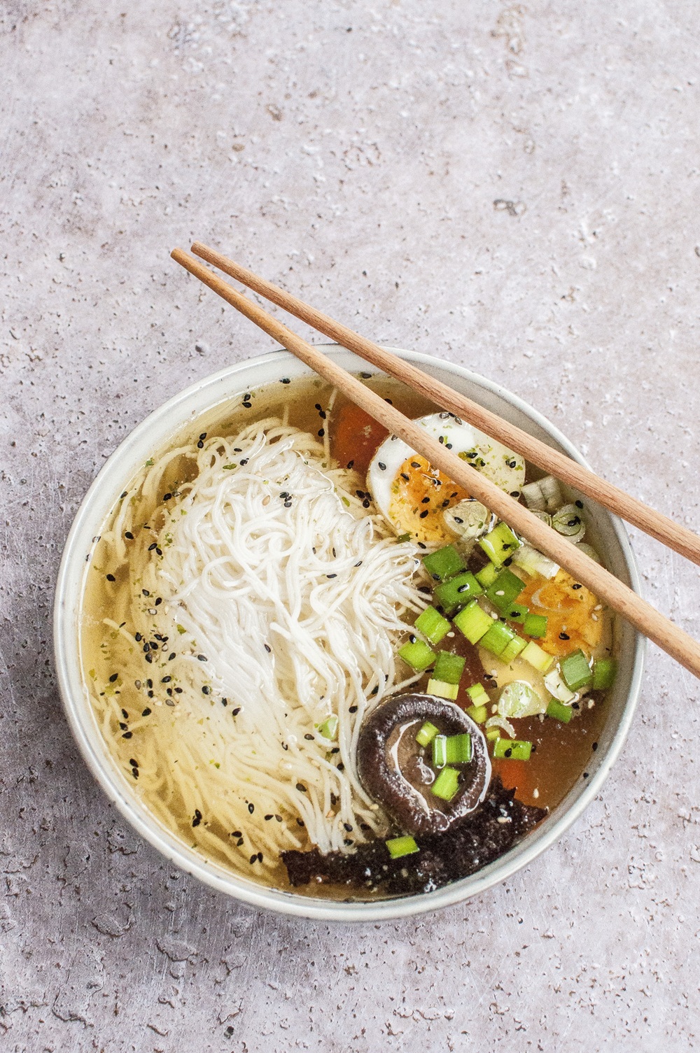 Marynowane jaja (ajitsuke): Jajka ugotuj na pół miękko, ok. 4,5-5 minut, a następnie obierz ze skorupek i marynuj przez 12-24 godziny w mieszance na bazie: sosu sojowego, mirinu, sake i cukru. Ugotuj makaron ramen, według wskazówek na opakowaniu. Doprowadź do zagotowania bulion, dodaj do niego sos sojowy. W misce ułóż makaron, zalej bulionem. Dodaj jajko, szczypior i posyp shichimi togarashi lub furikake. Na koniec skrop olejem sezamowym.