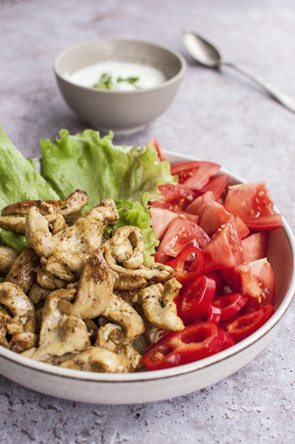 Zamarynuj mięso lub boczniaki w marynacie przygotowanej z jogurtu, oliwy i 1 łyżki przyprawy shawarma. Odstaw na 20 minut. Następnie rozgrzej patelnię, wlej oliwę i smaż na dużym ogniu aż lekko się przypiecze. Mięso wyłóż na talerz, polej płynną tahiną, obok ułóż wybrane pokrojone warzywa np. pomidory, ogórka, sałatę i paprykę oraz ryż.